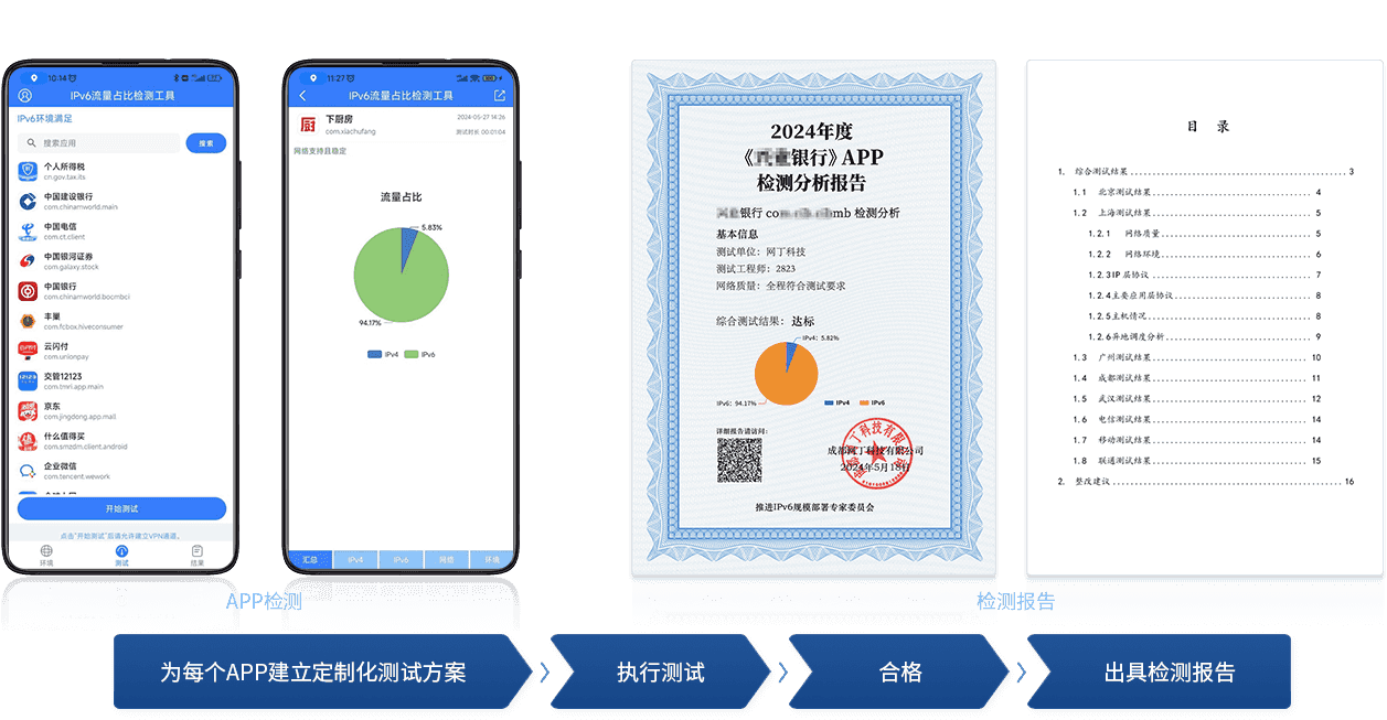 公司是工信部、推进lPv6规模部署专家委员会指定APPIPV6检测工具提供方,检测准确性已通过工信部、推进IPv6规模部署专家委员会认证。