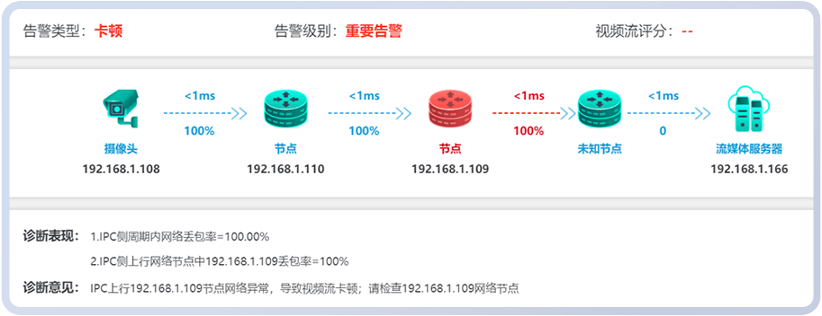 采用AI算法对故障进行自动诊断定位,业内首次实现故障定位到具体网元具体根因,包括摄像头、网络设备、NVR、视频网关、存储、视频平台等环节。