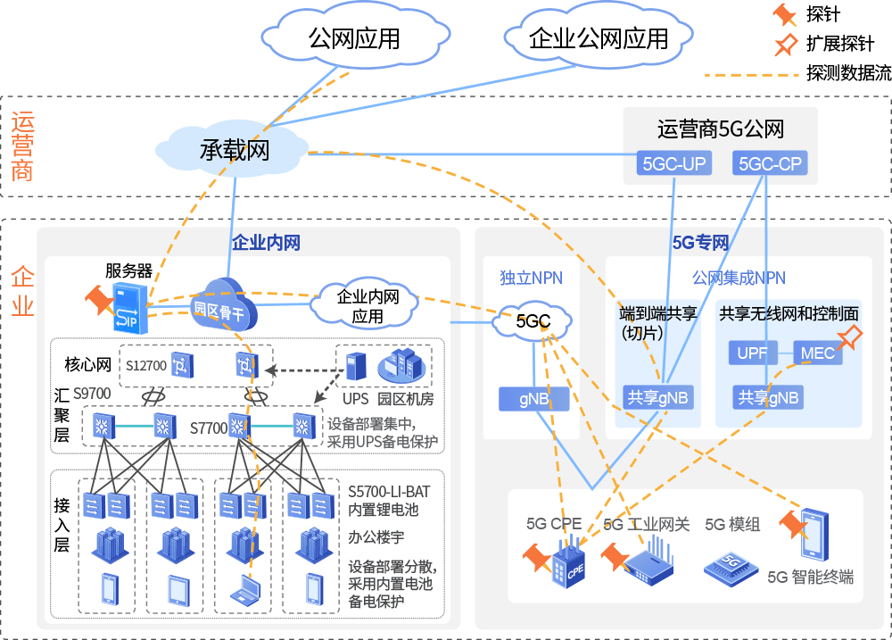在应用侧、MEC侧、接入侧、终端等多节点部署探针,通过业务仿真探测等多种探测技术,自动获取端到端业务连接拓扑,包括企业内网、运营商专线和5G专网等环节,实现“一个企业,多种网络,一张拓扑”。