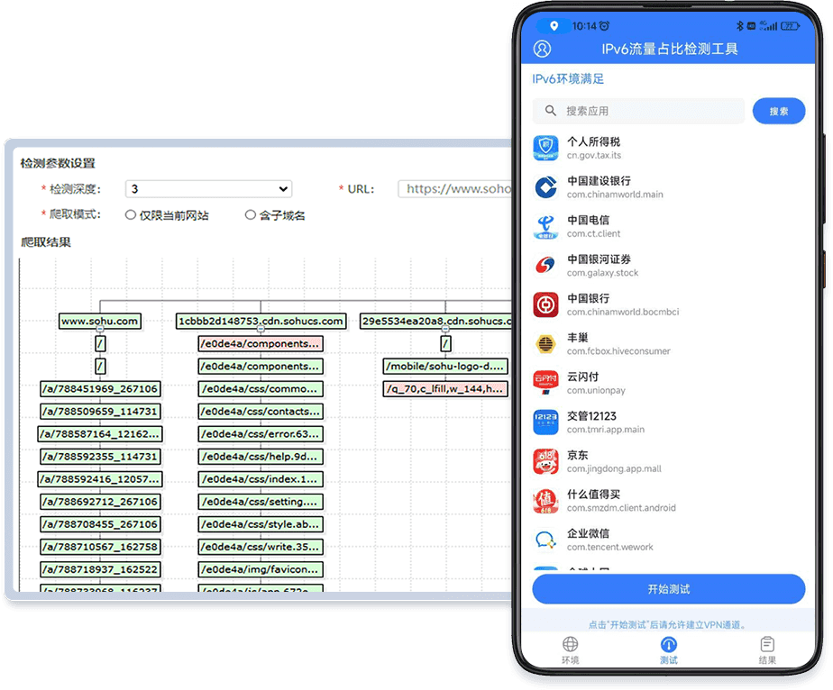 按照国标测试标准和测试流程,为用户提供专业化的网站IPv6支持度评测,包括手机网站访问和PC网站访问测试。
