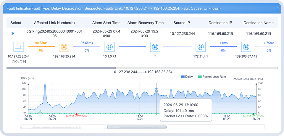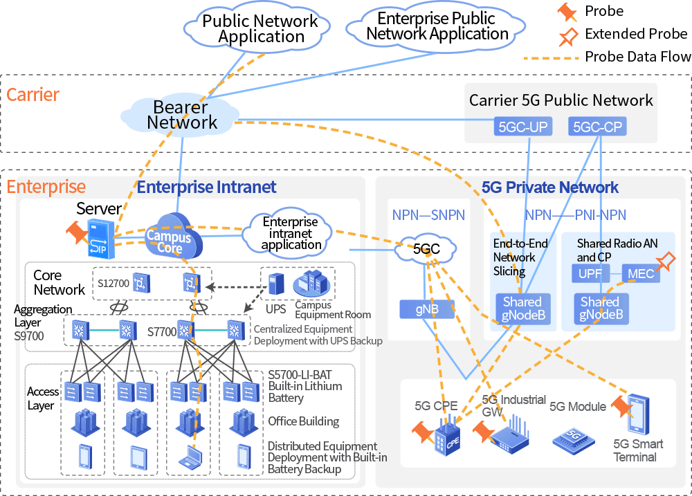 Deploy probes at multiple nodes including the application side, MEC (Multi-access Edge Computing) side, access side, and terminals. Utilizing various detection technologies such as service simulation probing, the solution automatically captures end-to-end service connection topology. This encompasses enterprise intranets, carrier dedicated lines, and 5G private networks, achieving 'one enterprise, multiple networks, one unified topology'."