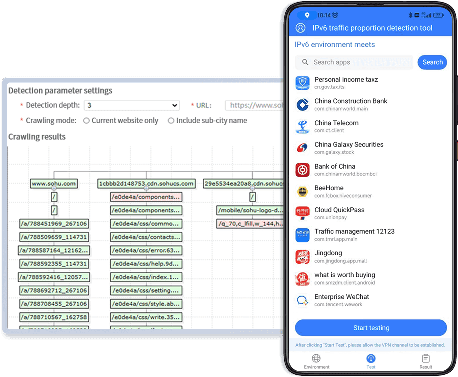 According to the national standard test standards and test procedures, we provide users with professional website IPv6 support evaluation, including mobile website access and PC website access tests.