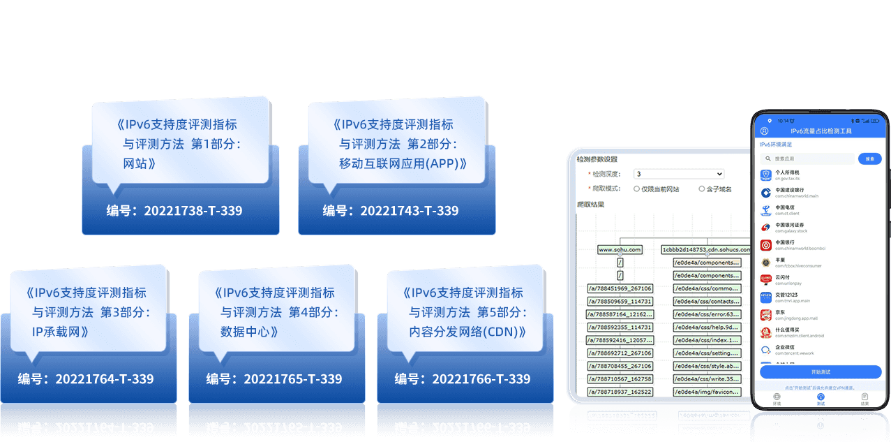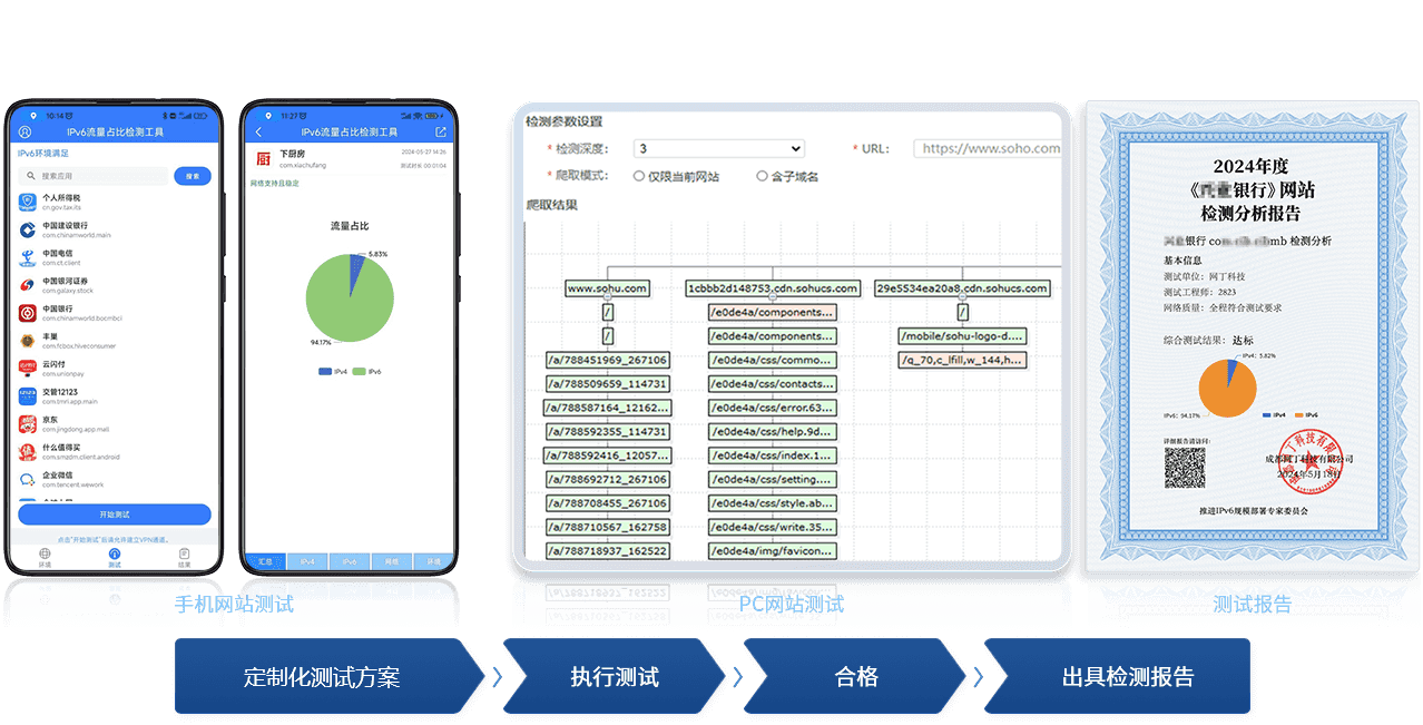 按照国标测试标准和测试流程,为用户提供专业化的网站IPv6支持度评测,包括手机网站访问和PC网站访问测试。